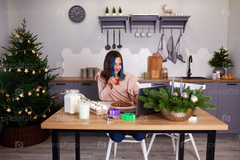 Счастливая девушка показывает печенье на экране ноутбука. Онлайн мастер-класс по приготовлению новогодних пряников в домашних условиях