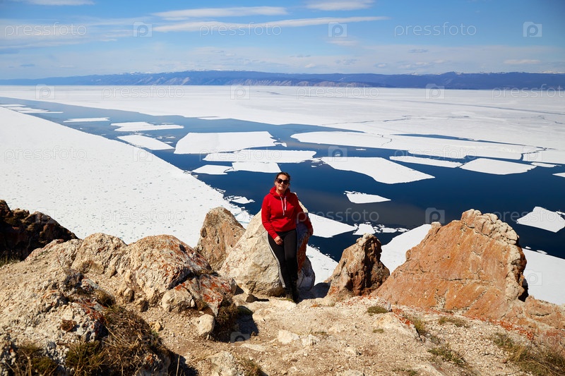 Женщина путешествует по озеру Байкал весной. Популярное туристическое направление на севере острова Ольхон