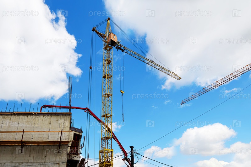 Краны и другое оборудование на строительной площадке на фоне голубого неба. Строительство здания