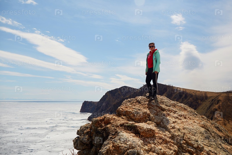 Байкал весной. Женщина едет на север острова Ольхон, мыс Хобой