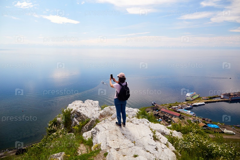 Женщина-путешественница стоит на скале возле порта Байкал и фотографирует озеро Байкал