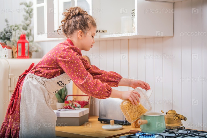 Маленькая девочка на кухне в фартуке что-то готовит в кастрюле на газовой плите
