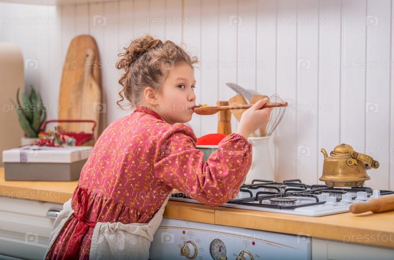 Маленькая девочка на кухне в фартуке что-то готовит в кастрюле на газовой плите