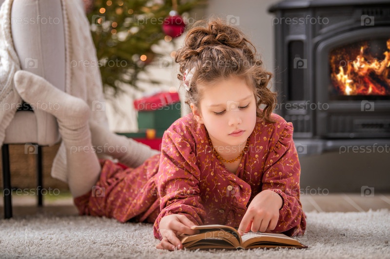 Милая маленькая девочка читает книгу дома в обжитом интерьере возле елки на фоне горящего камина