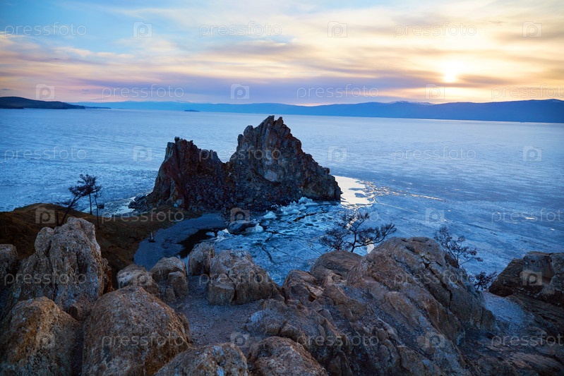 Красивый вид на мыс Бурхан или скалу Шаманка на закате. Остров Ольхон