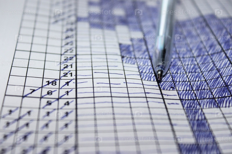 ручка на листе с решенным японским кроссвордом. Досуг