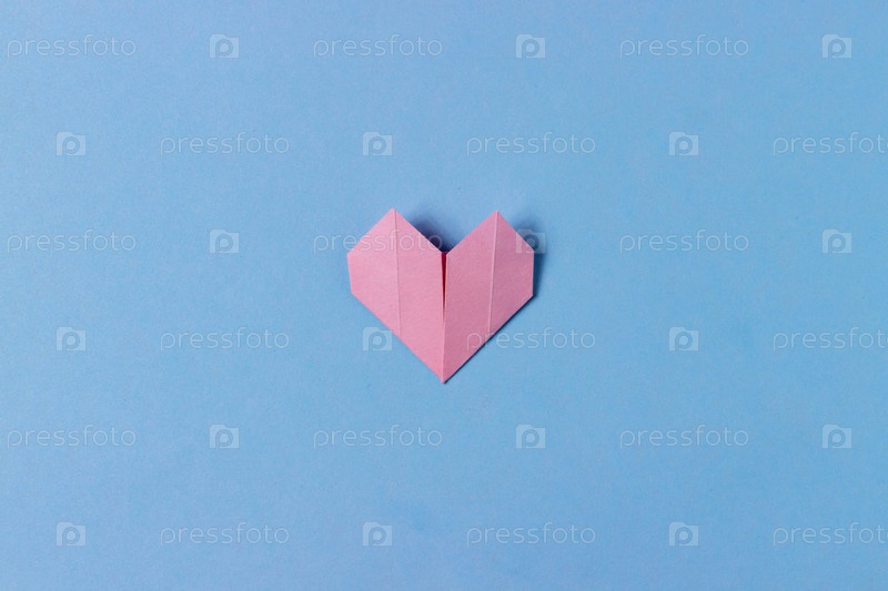 Сердце сложено из розовой бумаги в технике оригами на голубом фоне. Концепция любви, праздника, заботы, здоровья, жизни. Минималистичный фон