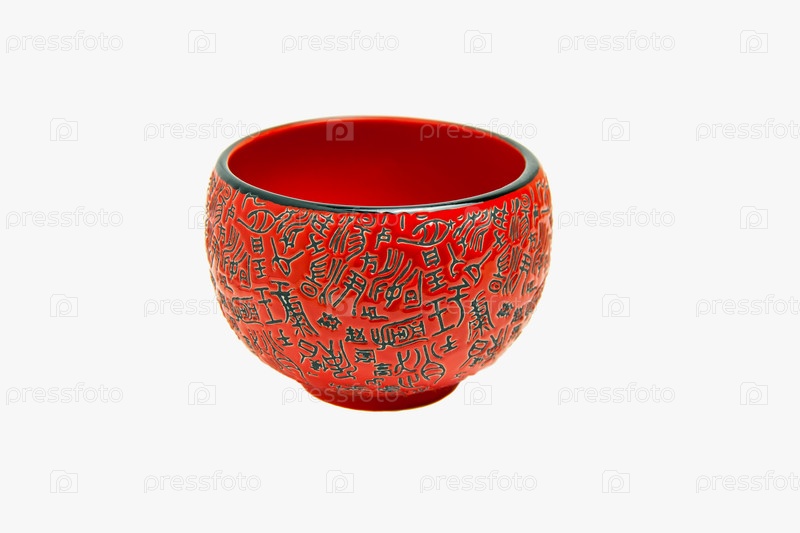 Красная фарфоровая чаша с китайскими иероглифами на белом фоне