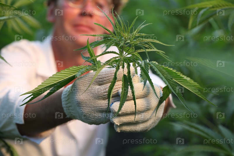 Ученый биолог работает в конопляном поле