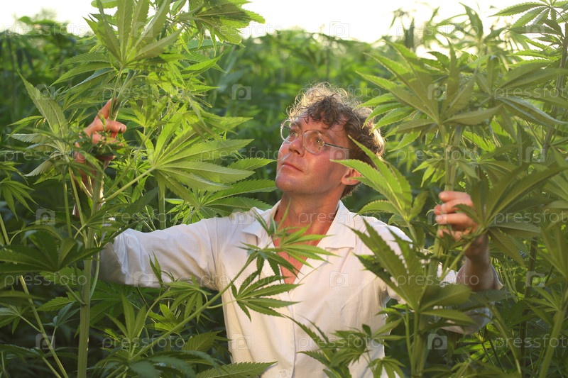 Ученый биолог работает в конопляном поле