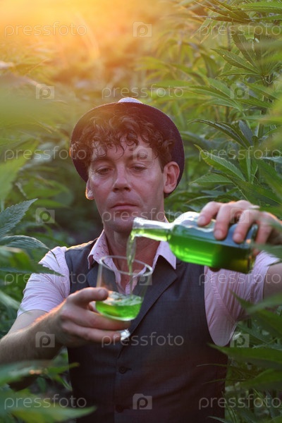 Мужчина наливает конопляное вино из бутылки