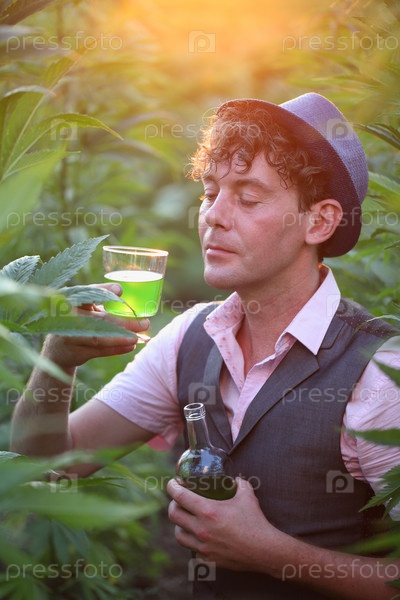 Мужчина наливает конопляное вино из бутылки