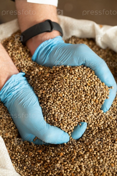 Мужские руки с семенами технической конопли