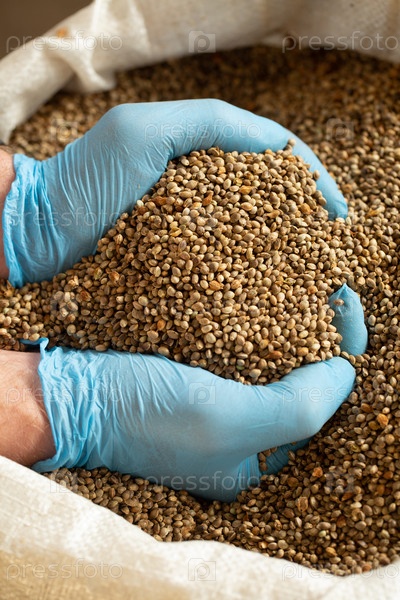 Мужские руки с семенами технической конопли