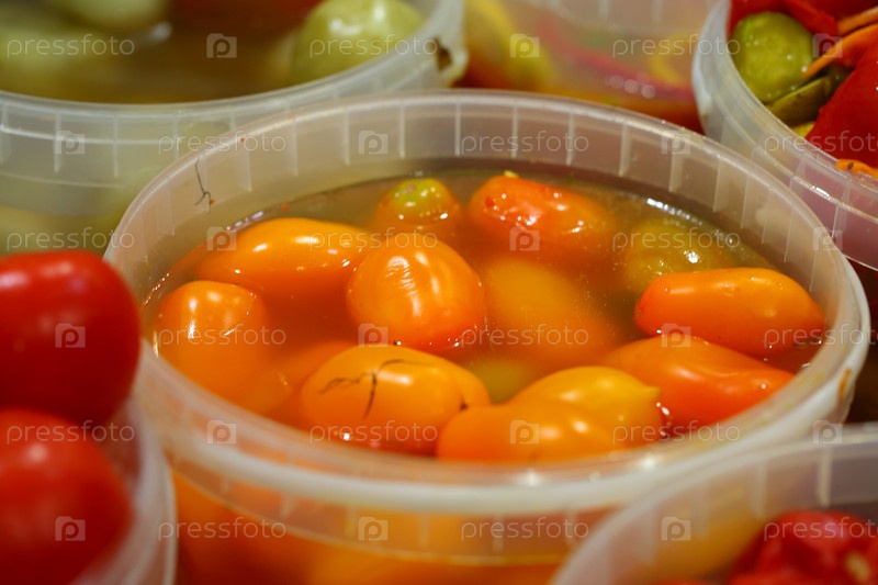 Квашеные красные помидоры на прилавке в магазине