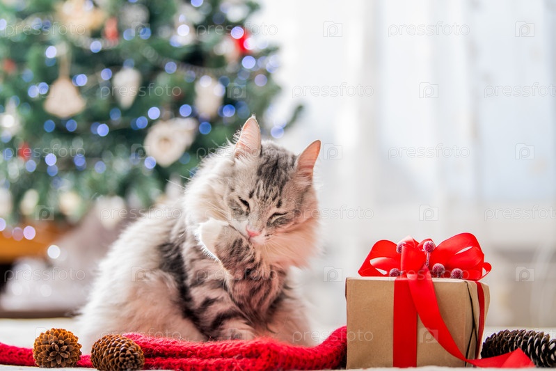 Рождественский кот. Портрет толстого пушистого кота рядом с подарочной коробкой на фоне елки и огней гирлянд