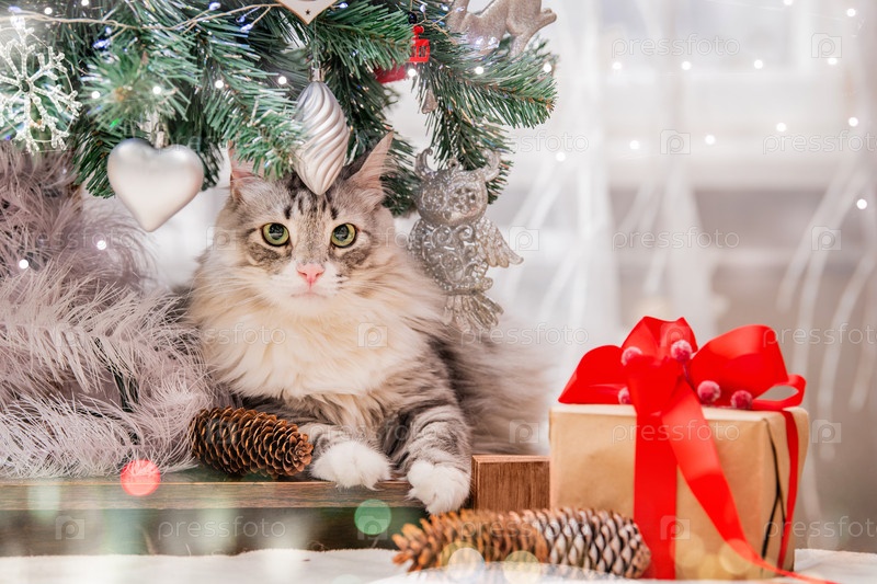 Рождественский кот. Портрет толстого пушистого кота рядом с подарочной коробкой на фоне елки и огней гирлянд