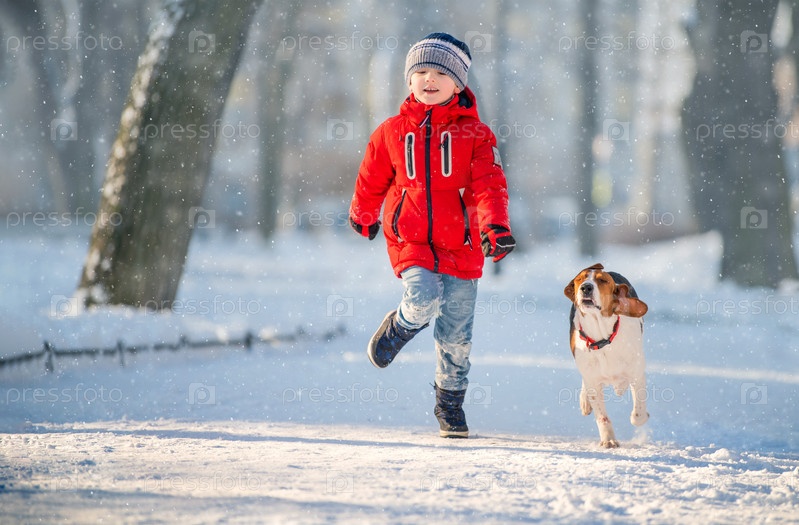 Мальчик в красной куртке и американский бигль вместе бегают по снегу на камеру зимой в парке
