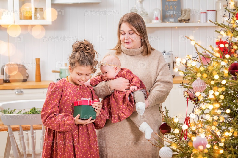 Счастливая семейная мама с детьми играет, рассматривает рождественские подарки в домашнем обжитом украшенном интерьере