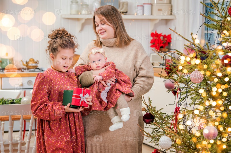 Счастливая семейная мама с детьми играет, рассматривает рождественские подарки в домашнем обжитом украшенном интерьере
