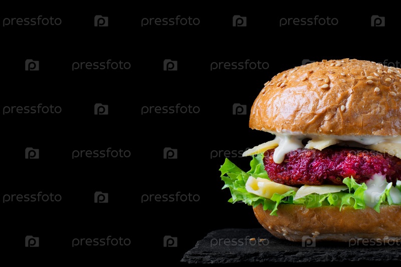 Свекольный бургер с салатом, сыром и йогуртовым соусом на черном фоне. Здоровая альтернатива мясу. Фото в низком ключе. Копировать пространство