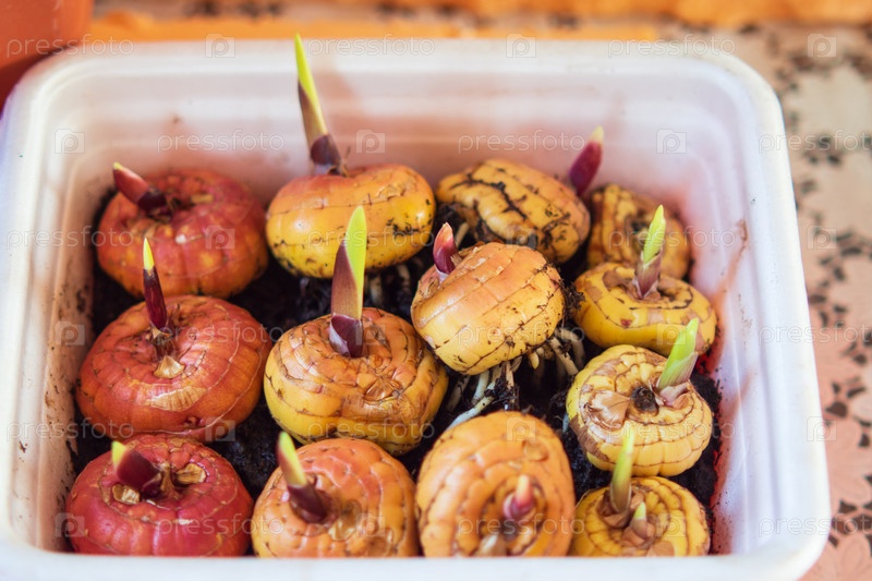 Посадка луковиц цветов гладиолуса весной, подготовка к высадке в грунт. Проросшие луковицы гладиолусов в контейнере с почвой. Луковицы гладиолусов перед посадкой. Весеннее цветоводство