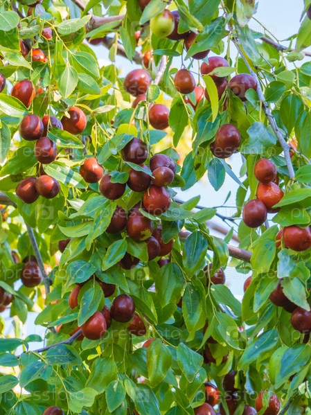 Фруктовый фон Ziziphus, экзотические фрукты и зеленые листья мармеладных плодов. Зизифус ююба. Зрелые сочные ягоды мармелады среди зелёного листа. Зрелый унаби на ветке дерева в саду