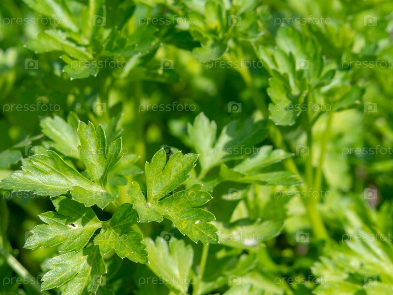 Ветви петрушки с зелеными листьями макрофото в солнечный весенний день в саду. Крупный план натуральных необработанных растений петрушки в естественных условиях