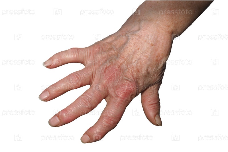 Рука пожилой женщины, деформированной ревматоидным артритом, изолирована на белом фоне