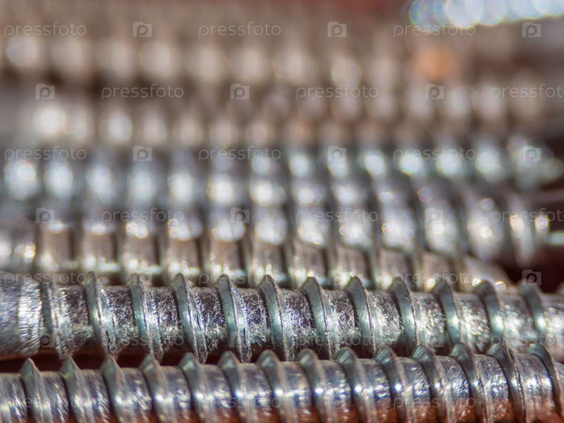 Крайний крупный план винтов с малой глубиной резкости. Красочный фон мебельной фурнитуры. Макрофотография саморезов или шурупов