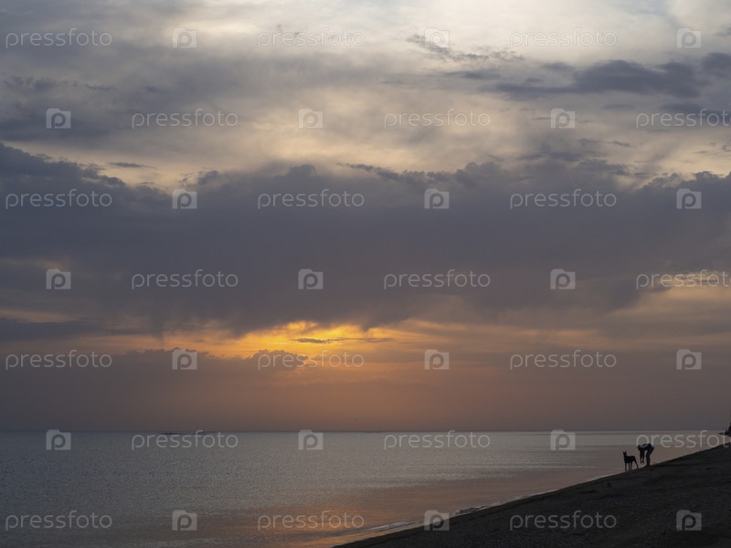 Силуэты девушки с собакой, гуляющей и веселящейся на берегу моря у кромки воды на фоне закатного неба