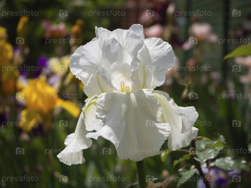 Крупный план цветущего нежного белого ириса на фоне размытого цветочного луга