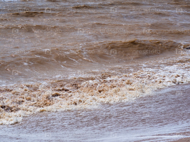 Мутная морская вода от сильных ветровых волн. Грязные бурые волны накатывают на берег. Морская вода с взвесью глины от размыва береговой линии