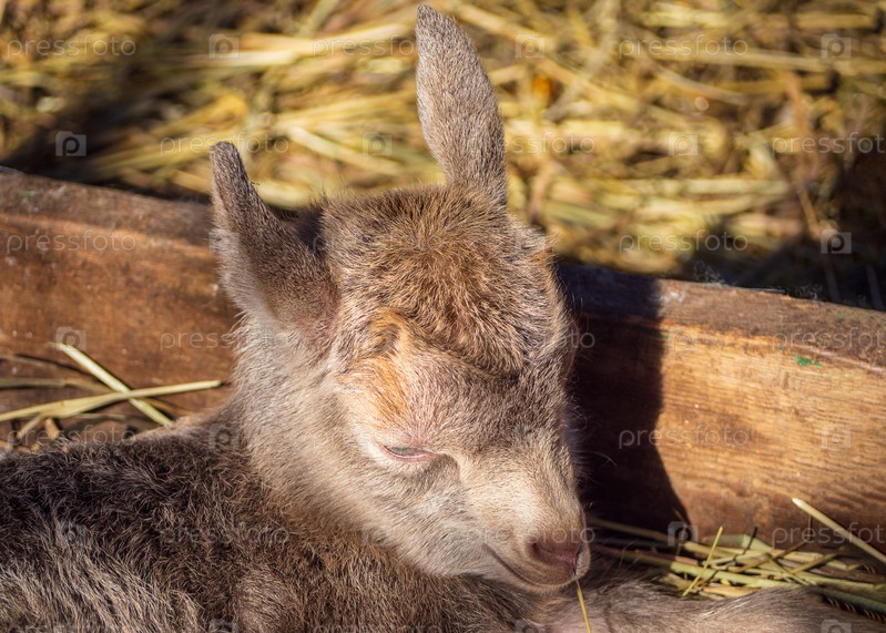 Козленок. Крупный план морды маленькой красивой козы. Серо-коричневый новорожденный козленок лежит в крытом загоне на сене. Разведение домашних сельскохозяйственных животных