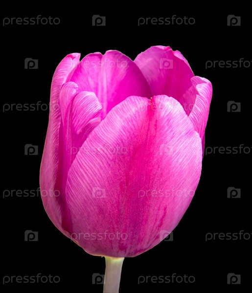 Цветок сиренево-фиолетового тюльпана изолирован на черном фоне. Крупный план цветочного бутона с малой глубиной резкости