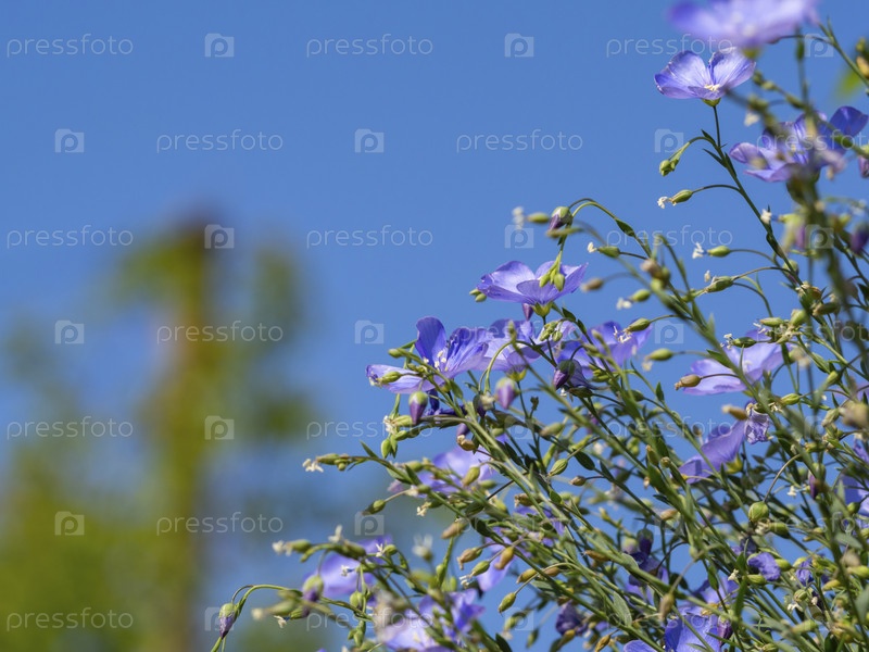 Голубые цветы льна крупным планом на фоне голубого неба в поле цветов льна. Голубые цветы флокса дивариката цветут на лужайке