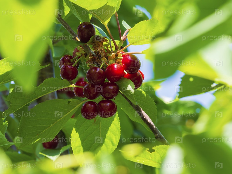 Спелые темно-красные вишни, растущие на вишневом дереве, среди зеленой листвы на солнце. Органический сад. Куча спелых вишен на ветке в листве