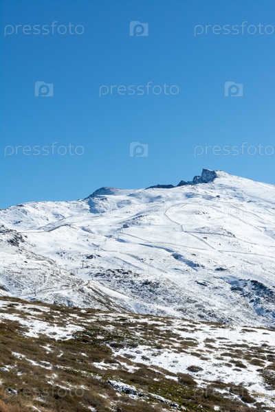 Панорамный вид на горнолыжный курорт в сьерра-неваде, лыжники вдоль склонов,
