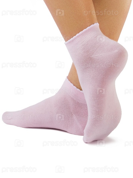 Вид сбоку на красивую женскую ногу, одетую в новые красивые и мягкие натуральные хлопчатобумажные ткани, пустые розовые носки, изолированные на белом фоне. Концепция ношения и спортивной одежды. Подробная студийная съемка крупным планом