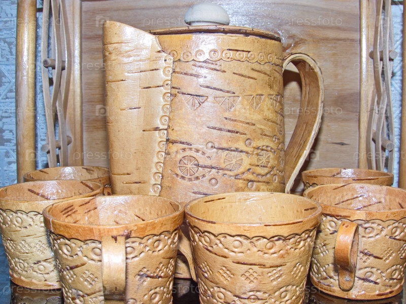 Чашки, сахарница, чайник и поднос из бересты. Кухонные принадлежности. Народные промыслы России. Ретро. Изделия из бересты изготавливались большинством обществ задолго до того, как была изобретена керамика