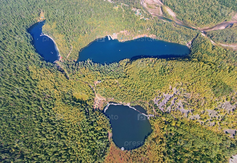 Три озера в окружении осеннего леса с воздуха