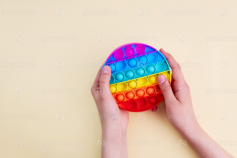 Поп это. Девушка играет с модной популярной радужной красочной антистрессовой игрушкой. Крупным планом