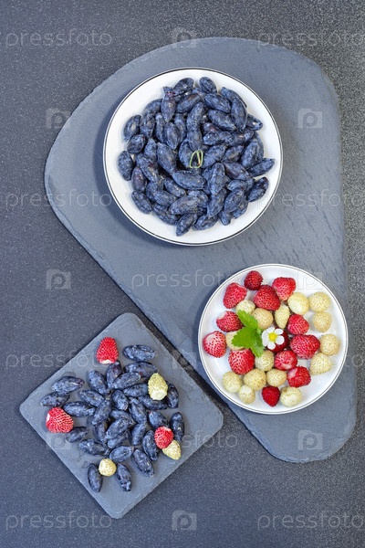 На столе первые ягоды летнего сезона, жимолость, белая и красная клубника. Выборочный фокус, вид сверху