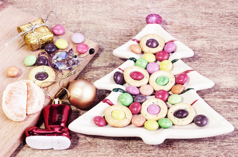 Тарелка в виде елки с кренделями и сладостями. Забавная игрушка стеклянная крыса