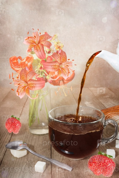 Чай наливают в стеклянную чашку, стоящую на деревянной поверхности. Выборочный фокус