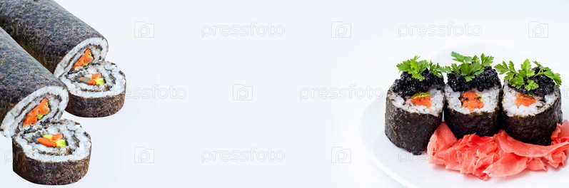Рулоны в тарелке и рулет, с лососем, икрой и маринованным имбирем на белом широкоформатном фоне. Выборочный фокус, баннер. Концепция приготовления