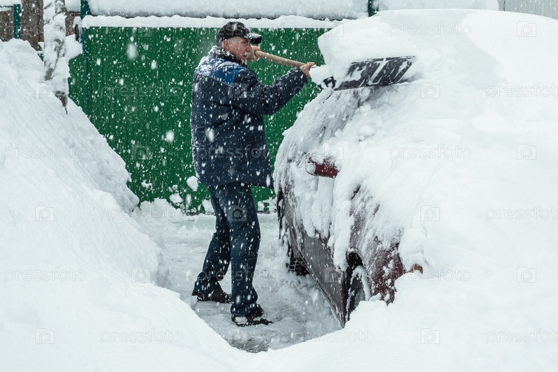 Мужчина в кепке счищает снег с автомобиля, засыпанного снегом во время снегопада. Падают крупные хлопья снега. Снежная зима в Европе. Глобальное изменение климата