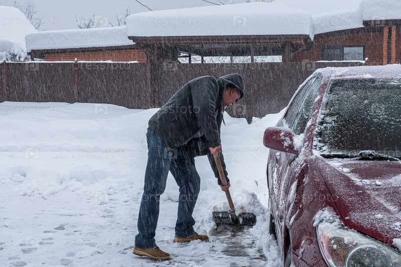 Мужчина лопатой чистит улицу от снега. Рядом стоит красная машина. На заднем плане серое небо, заснеженные крыши домов и снегопад. Расчистка улицы во время снежной бури