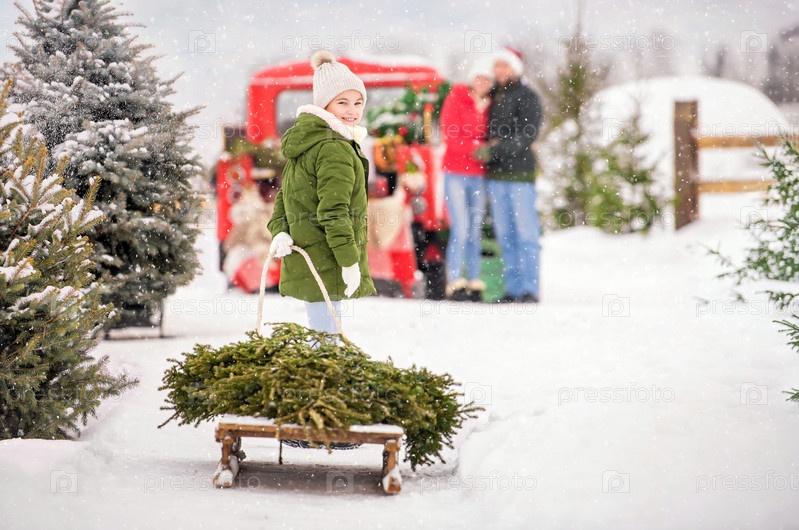Девочка везет на санях елку к родителям, которые ждут ее возле красной машины