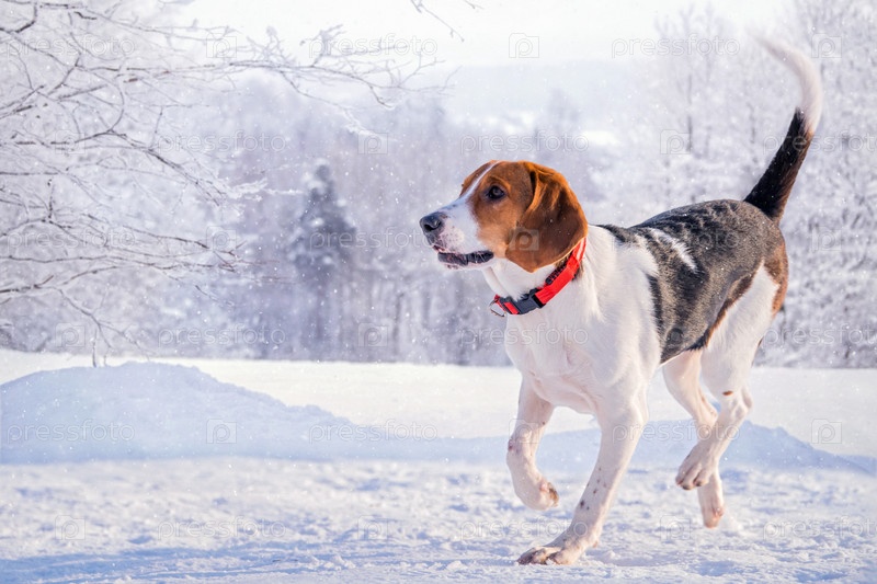 Портрет американской собаки-бигля, бегущей по снегу на камеру в парке зимой